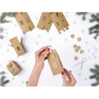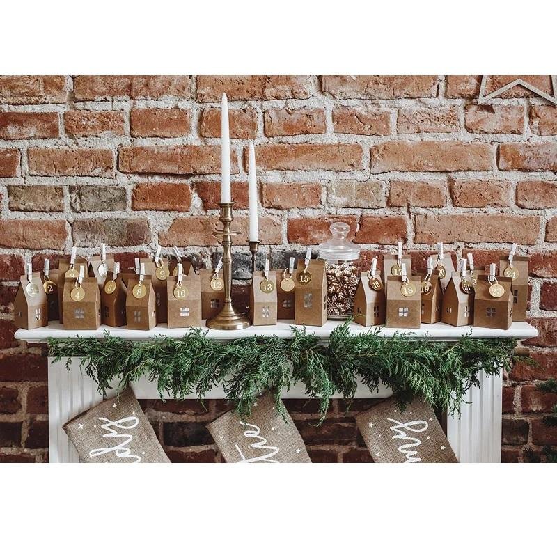 Rinkinyje rasite priemones pasigaminti 24 kraftinio popieiriaus nameliams (5x11x5cm, 4x14x6cm, 7x11x5cm): iškarpos nameliams, 24 medinius segtukus, etiketes su skaičiais, virveles bei šilko popierių.
