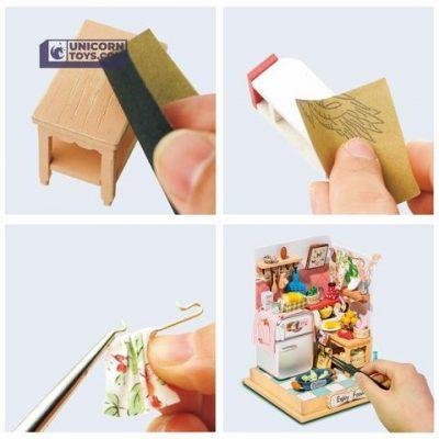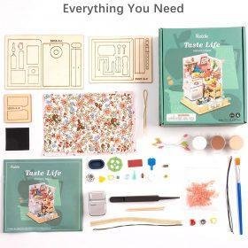 Kūrybinį rinkinį sudaro: pilnas kambario maketas, sudarytas iš medžio, plastiko, popieriaus ir tekstilės detalių, pincetas, klijai, dažai, teptukas ir gausybė mažų aksesuarų užpildančių interjerą.